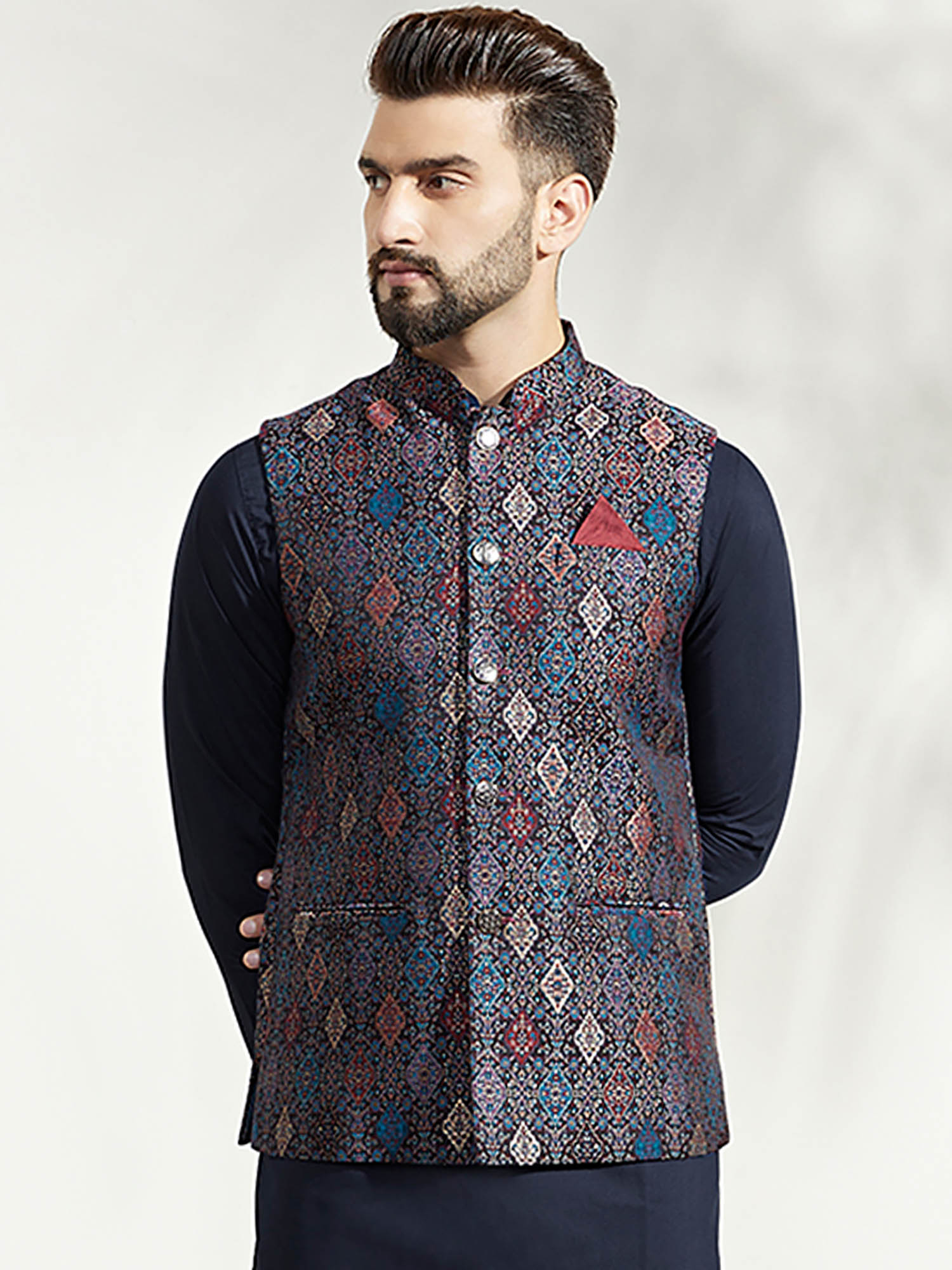 KISAH Men Multi Coloured Woven Silk Blend Jacquard Nehru Jacket with Zari Design (42)(42)