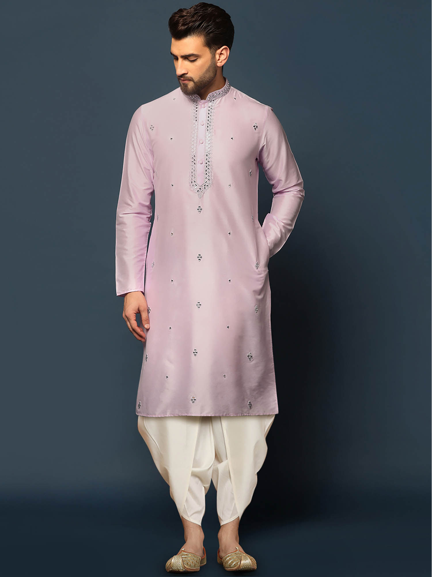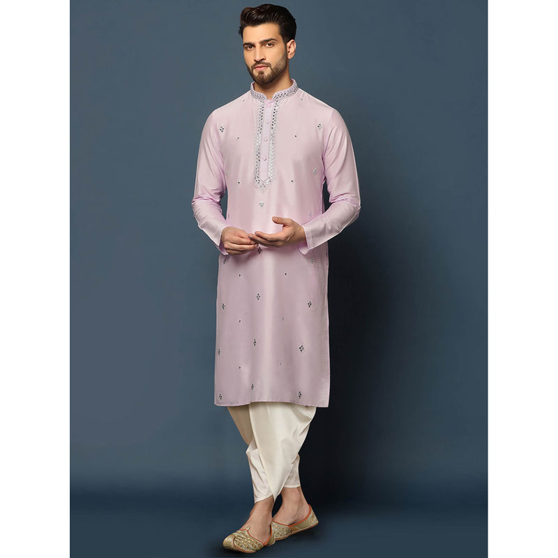 KISAH Men Lilac Mirror Work Embroidery Cotton Blend Kurta Dhoti Set with Abstract Print (44)(44)